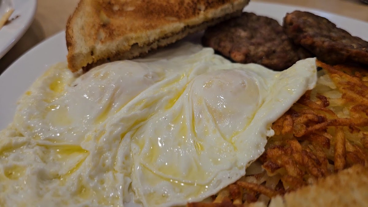 First time here for us, company has been here before. Husband and I thought it was good. I ordered pancake and sausage, husband ordered French toast, company ordered 2 eggs and ham and veggie omelette.